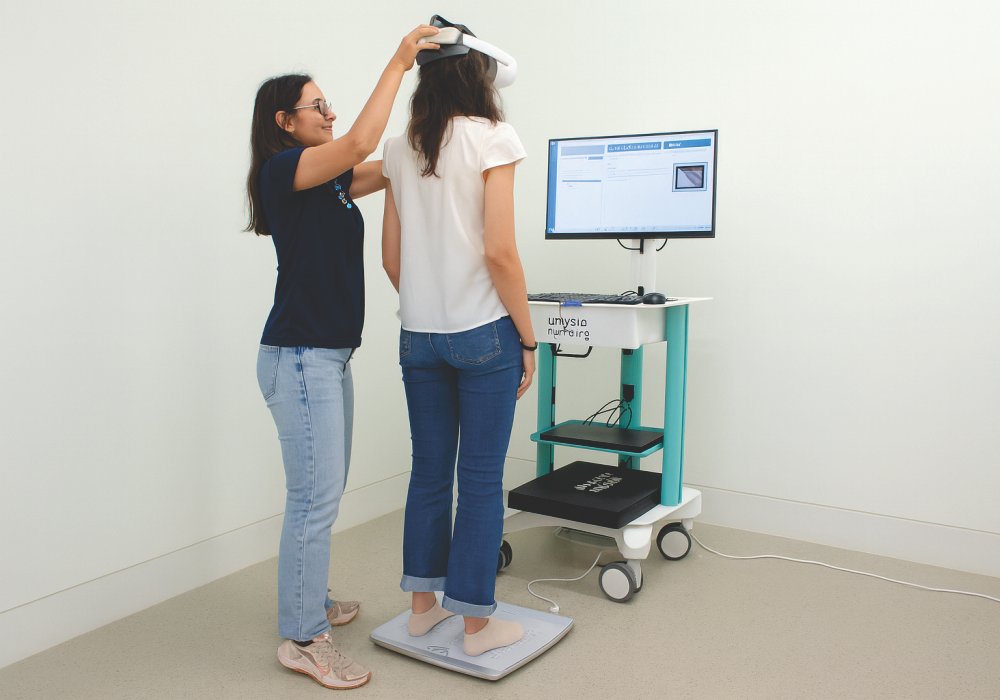 O PhysioSensing Vertigo é uma plataforma de força com realidade virtual para avaliação e reabilitação vestibular. Oferece testes como mCTSIB, Romberg e LOS, além de treinos com feedback imediato. Inclui exercícios interativos e cenários imersivos que auxiliam no tratamento de vertigens e distúrbios do equilíbrio.